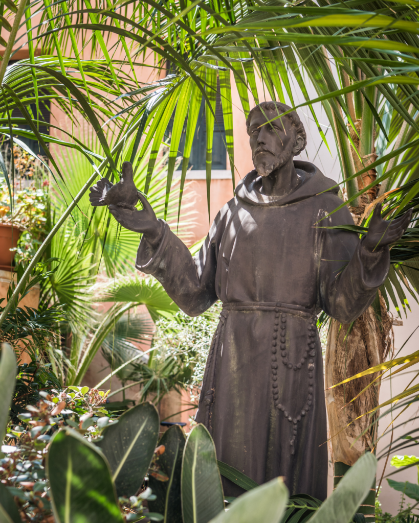Una statua di San Francesco che sostiene una colomba nella Cattedrale cattolica dell’Assunzione della Beata Vergine Maria a Chania, in Grecia.